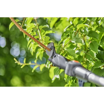 De Accu-telescooptakkenschaar HighCut 250/18V P4A gebruiksklare set van GARDENA helpt je gemakkelijk op grote hoogten te snoeien vanaf de grond. De takkenschaar heeft een maximale lengte van 2,5 meter, waardoor je in totaal wel 4 meter hoog kan snoeien. Dankzij de afneembare steel is de HighCut gemakkelijk te vervoeren en bewaren. De POWER FOR ALL-accu zorgt voor gemakkelijke sneden zonder dat je veel kracht hoeft te zetten. De originele GARDENA-messen zijn gemaakt in Duitsland van gehard staal en zorgen voor een nette snede in vers hout tot wel 28 mm in diameter. Ze hebben een antikleeflaag en zijn precisiegeslepen, zodat geknipt materiaal niet aan het mes blijft plakken. Gebruik de kantelende en smalle schaarkop om afzonderlijke takken te knippen, met een hoek van 60 graden. De gekantelde kop geeft je bovendien een goed zicht op wat je aan het snoeien bent. Als takken blijven hangen in de boom kan je ze gemakkelijk omlaag trekken, met de haak bovenop het handvat. De ledindicator in de ergonomische handgreep toont je de laadstatus van de accu. Een volle accu met 2,0 Ah maakt tot wel 400 sneden mogelijk. De GARDENA Accu-telescooptakkenschaar HighCut 250/18V P4A wordt geleverd als gebruiksklare set met een snellader en krachtige 18V POWER FOR ALL-accu. De POWER FOR ALL ALLIANCE is een van de grootste merkoverschrijdende accu-allianties van toonaangevende fabrikanten, wiens accu’s je kan gebruiken in talrijke apparaten in huis en tuin. Zo bespaar je geld maar blijf je toch flexibel! Na een eenvoudige online registratie geeft GARDENA een fabrieksgarantie van 3 jaar op de Accu-telescooptakkenschaar. Passion powered by GARDENA. EEN accusysteem voor alle taken in je tuin.